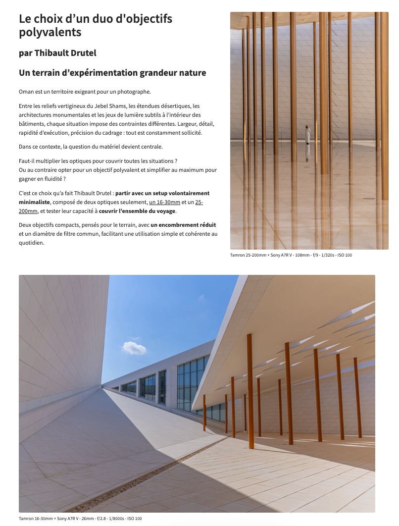 Tamron France vient de publier un article dans lequel je reviens sur mon approche photographique lors de mon voyage en Oman : partir avec un setup minimaliste - deux objectifs seulement, le 16-30mm et le 25-200mm - et tester leur capacité à couvrir l'ensemble du voyage.Entre les reliefs du Jebel Shams, les architectures monumentales et les lumières intérieures, chaque situation impose des contraintes différentes. Un retour d'expérience concret sur ce que gagne - et ce que ne perd pas - un photographe qui simplifie son matériel. Lire l'article sur le blog Tamron
